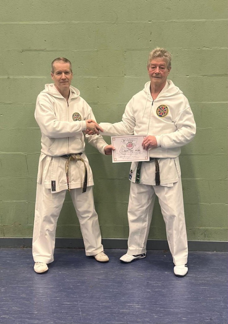 Pictured below: Sensei Gareth Rees receiving his 8th dan black belt from former world karate champion, Sensei Malcolm Hudson 9th dan February 2026. Sensei Rees has now been promoted to Hachidan within the Shukokai Karate Association.